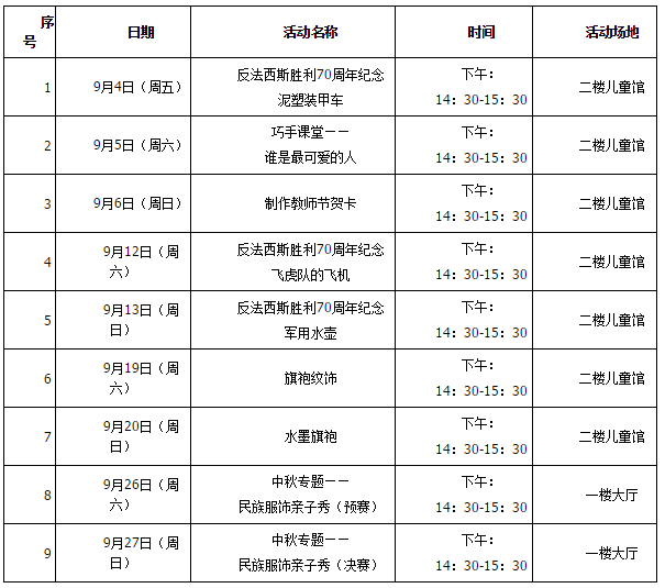 今年九月对于广大青少年儿童来说是很值得期待的,在这个九月,不仅有我们中华民族的传统节日“中秋节”,有纪念教师的节日“教师节”、“孔子诞辰”,最重要的,在9月3日我国将举行盛大的“抗战胜利70周年”阅兵仪式。在这个辉煌的金秋9月,云南省博物馆也推出了相应的少儿活动课堂,在拓展我们知识面的同时,带领大家更深入地了解中国历史、认识世界和平的重要性。