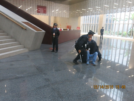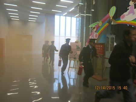下午3点演练开始,演练开始前物业安保工作人员整装待发,进行现场操练,展现安保工作水平技巧和工作热情。之后全部参与演练的工作人员在展览大厅内集合,由保卫科副科长张纪东、副科长孙建云、物业公司柏军经理向全体参演人员进行讲话动员,说明此次消防演练目的和流程。讲话完毕后,各小组前往工作位置就位,由物业公司工作人员模拟群众在讲解员的带领下进入远古云南展厅进行参观,之后总指挥于指挥中心通过对讲机宣布演练正式开始,保卫科工作人员将演练用烟雾弹进行投放,后勤部工作人员手动在模拟火灾事发现场进行手动报警,消控室接收到火灾警报后通过对讲机指挥展厅安保人员前往确认火情后立即发布火情警报和轮流播报语音广播要求现场观众通过疏散通道撤离,在场安保人员立即引导观众从远古云南各个疏散通道疏散出展厅,整个疏散过程有条不紊快速进行,同时指挥中心通过对讲系统得知警情后立即通知三层安保带班班长组织部分安保工作人员组成行动处置组并获取灭火器后前往现场模拟扑救,消控室立即联络后勤及物业机电维修人员组成抢修维护组前往现场进行抢修。并且在演练中模拟发生人员因火灾受伤的情况,一层物业安保工作者根据二层巡查人员的报告立即将救护担架和医药箱带至模拟受伤人员处将其担护至一层大厅进行模拟救治,最后行动处置组模拟报告火情扑灭、抢修维护组模拟报告检修完毕、现场巡查人员模拟抓获趁火盗抢嫌疑人并扭押至安全地点盘问并进行报告后此次消防演练完美结束,在结束后全部参演工作人员在展厅大门外集合,由孙建云总指挥和张纪东副指挥、顾永平副指挥、柏军副指挥现场对此次演练过程、结果以及发现的问题进行了总结,同时对各位参演人员的积极表现进行表扬及感谢。