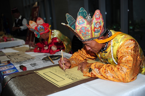 东巴画是最具特色纳西族美术遗产。纳西族东在做仪式时,要绘画各种各样的佛神、人物、动物、植物以及妖魔鬼怪的形象,并对他们进膜拜与祭祀,这种服务于宗教活动的各种绘画,统称为东巴画。东巴画是东巴文化的重要内容之一,它的内容主要表现古代纳西族信仰的神灵鬼怪和各种理想世界,其中也反映了古代纳西族社会的各种世俗生活。它主要用于东巴教的各种仪式中。它以东巴教中的诸鬼神为绘画对象,常见的有经书的封面和题图,做佛事时用的布帛(卷)画、木牌等,主要用于东巴教的各种仪式中。用自制的竹笔蘸松烟墨勾画轮廊,然后敷以各种自然颜色,绚丽多彩,历经数百年而不褪色。其绘画形象具有强烈的原始意味,以线条表现为主,并不注重事物外部的形体比例,但朴实生动,奇异诡谲,野趣横生,色彩多用原色,鲜艳夺目。许多画面亦字亦画,保留了浓郁的象形文字书写特征,是研究人类原始绘画艺术的“活化石”。