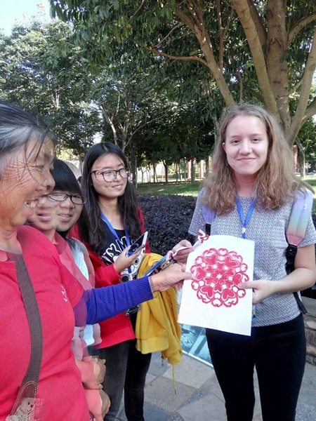志愿者送给俄罗斯同学一个剪好的图案,她很喜欢,把剪纸做书签来保存