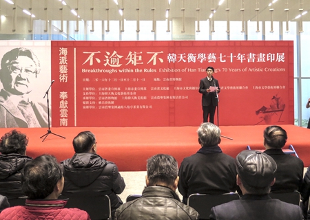 云南省文联秘书长张碧伟宣读了上海市宣传部长董云虎的贺信,衷心祝愿展览取得圆满成功。原解放军副总参谋长熊光楷上将代表韩天衡文化艺术基金会顾问委员会发表了讲话,以自身切实感受发表从艺的感悟,秉持韩老理念,将海派艺术及多民族艺术结合起来,积极发展艺术文化事业。