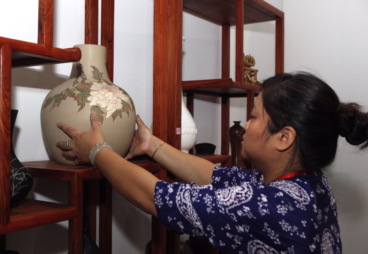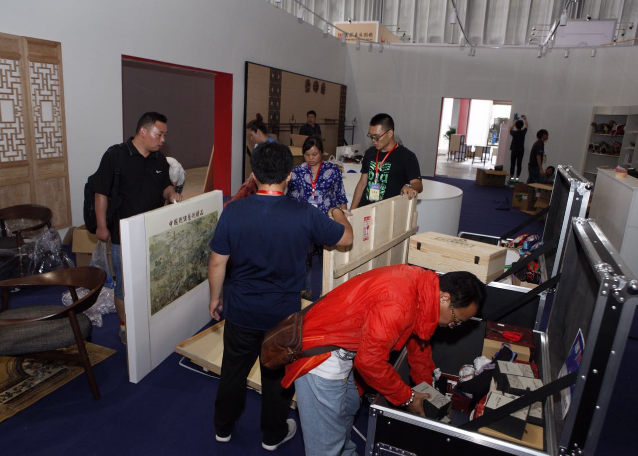 8月10日,云南省博物馆文创产品在昆明国际会展中心布展,展览展出的文创产品种类繁多,各具特色,图为工作人员正在布展。本次展览展出的时间是2016年8月11日—8月15日。
