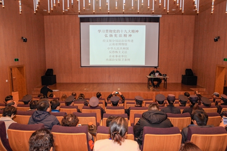 12月5日上午,为学习贯彻党的十九大精神、弘扬宪法精神,昆明市经文保分局法治宣传走进我馆,李德处长结合博物馆全安保卫工作,从中华人民共和国反恐怖主义法、企业事业单位内部治安保卫条例、博物馆安全保卫规定等三方面进行了深入的讲解,提升了我馆全体职工的法律意识和观念。