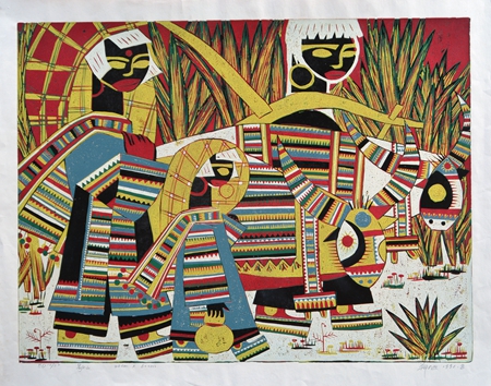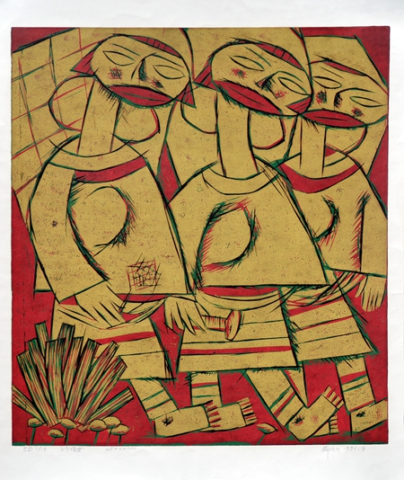 《三个佤女》 绝版木刻 45×40cm 1991年
