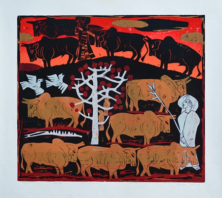 他坚守云南民族文化的根,在意识中展开思想的翅膀,在精神世界里无拘无束地遨游,绝版木刻的个性表达,只是他表现思想创意的方式之一。他的思想世界仿佛长了一双有力的翅膀,在高空展开,把生命带入永恒的异乡。