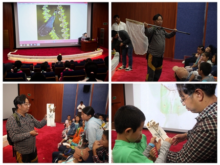 讲座现场,昆虫科研者王鹏老师不仅展示了一系列五彩缤纷、形态各异的昆虫图片,还现场演示,手把手教给小朋友制作标本的诀窍。此外,专家还向小朋友们讲解了昆虫的起源、生存、习性、繁殖,以及碰到有害昆虫怎样避免受到伤害的知识。