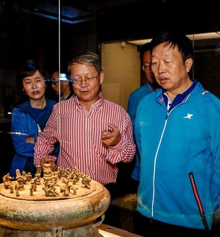 当日上午,2017昆明高原国际半程马拉松赛从我馆起跑,市委领导在起跑仪式后来到我馆视察参观。云南省博物馆馆长马文斗热情接待并为领导们讲解我馆展览及文物特色。在参观了牛虎铜案等古滇国青铜器及聂耳的小提琴等近代文物之后,市委领导表示,博物馆要大力宣传我省优秀的传统历史文化,弘扬爱国主义精神,为广大观众提供更好的文化服务。
