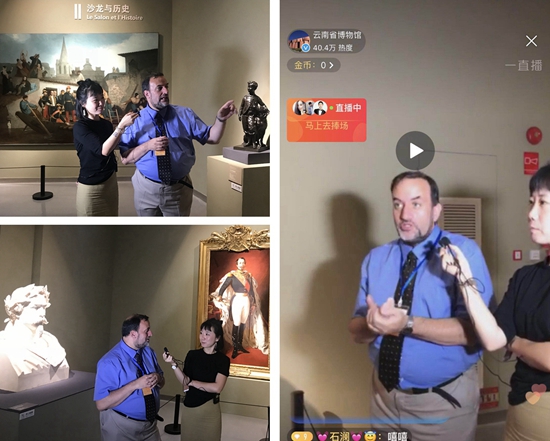 当天下午15时起,接近1个小时的时间里,法国国家造型艺术中心历史及现代收藏品部负责人Xavier-Philippe Guiochon和策展助理王滴带领观众们徜徉在展厅当中,从展厅的布展细节、展品的历史背景等多个方面详细解说了此次展览的亮点。本次直播吸引了40.7万网友观看,打破了云南省博物馆直播观看人数记录。