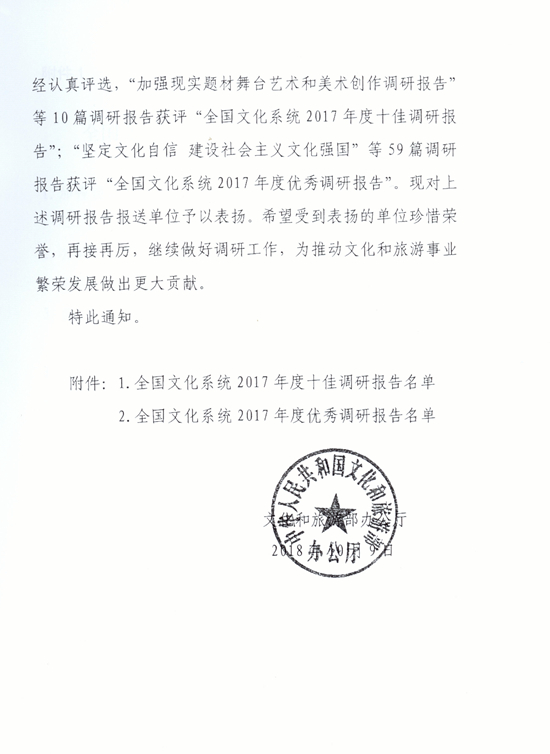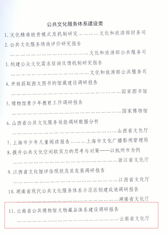 2018年10月9日,文化和旅游部发布了“文化和旅游部关于表扬全国文化系统2017年度十佳调研报告和优秀调研报告的通知”。其中,由云南省文化和旅游厅选送的《云南省公共博物馆文物藏品体系建设调研报告》被评选为全国文化系统2017年度优秀调研报告。