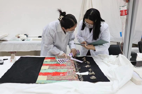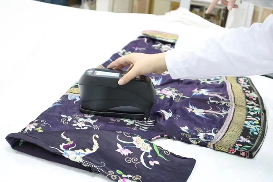 保护修复团队针对这批纺织品文物多种材质共存的特点,充分考虑其差异性,借助现代仪器设备,对文物所用面料的质地、纺织工艺进行深入探究;对文物染料种属及成分进行检测;对文物病害成因进行分析。采取相适应的方法妥善保护修复了这批珍贵文物,进而延长文物寿命,增加文物强度,使其达到安全展陈、易于保管的目标。