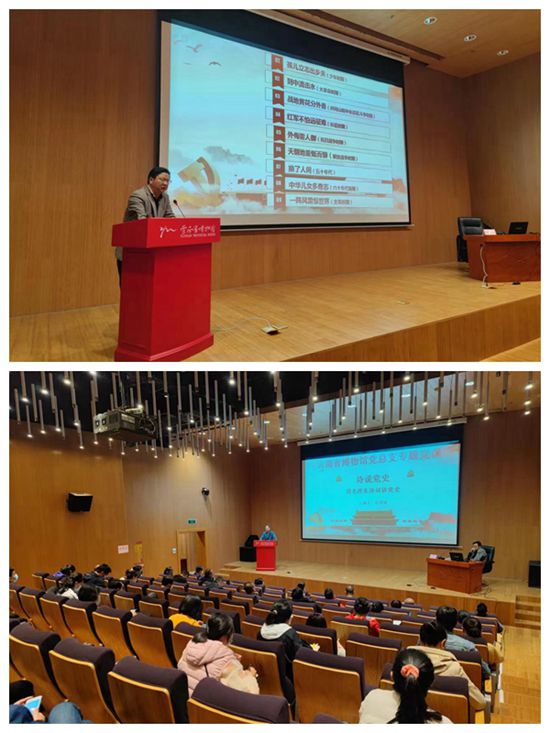 此次党课主题为《诗说党史——用毛泽东诗词讲党史》,课程以诗为线索,以史为内容,以诗论史,诗史融合。讲述了中国共产党百年奋斗的艰苦历程和光辉业绩,诠释了百年历史就是党领导中华民族和中国人民救国、兴国、富国、强国的历史。该课程由九个篇章组成:第一篇章:《孩儿立志出乡关》(少年时期);第二篇章:《到中流击水》(大革命时期);第三篇章:《战地黄花分外香》(井冈山和中央苏区斗争时期);第四篇章:《红军不怕远征难》(长征时期);第五篇章:《外侮需人御》(抗日战争时期);第六篇章:《天翻地覆慨而慷》(解放战争时期);第七篇章:《换了人间》(五十年代);第八篇章:《中华儿女多奇志》(六十年代前期);第九篇章:《一阵风雷惊世界》(文革时期)。