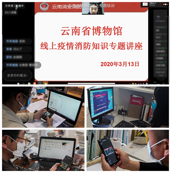 经馆领导研究决定,疫情期间,为避免人员集中开会,结合上级及消防主管部门要求,根据我馆的实际工作情况,为切实加强全馆干部职工的消防安全意识,随着疫情防控形式的好转,为全面推动博物馆的对外开放工作。2020年3月13日上午9:30分,云南省博物馆联合云南消安消防普及中心,开展了消防安全网络直播培训。