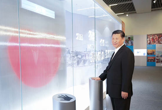 2017年6月26日,中共中央总书记、国家主席、中央军委主席习近平在国家博物馆参观香港回归祖国20周年成就展。这是习近平按下“同心圆”互动装置的触摸板。这个“同心圆”互动装置代表着香港同胞和内地同胞齐心协力、携手合作,一起为国家发展贡献力量。 新华社记者 姚大伟/摄