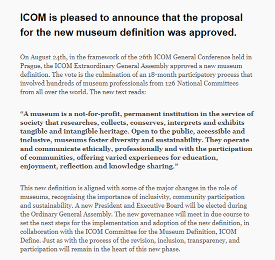 ICOM 很高兴地宣布新博物馆定义的提案获得批准。